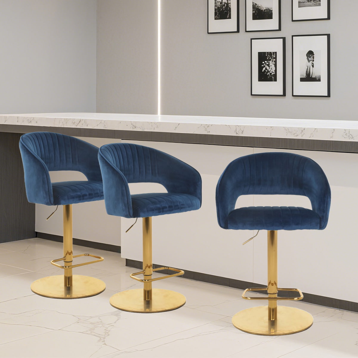 Tabouret de barre pivotant réglable en velours de la marine courbe avec dos creux et base d'or