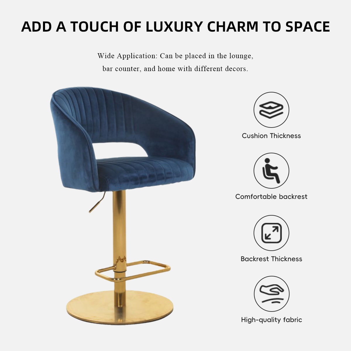 Améliorez votre salle à manger ou votre salon avec ce tabouret de bar réglable en velours de la marine moderne avec une base pivotante, un piédestal doré et un design à dos creux incurvé. Parfaitement adapté aux îlots de cuisine, aux bars à domicile, aux pubs et aux zones de réception, cette chaise de bar en velours tufted combine le luxe et la fonctionnalité. Le tabouret de barre de lifting à gaz avec repose-pieds offre un ajustement de hauteur sans effort et un siège ergonomique de soutien, ce qui le rend idéal pour les séances de longue assise.