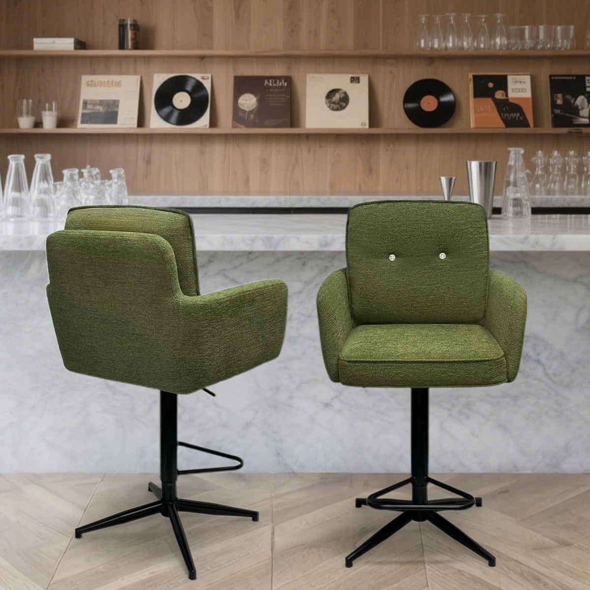 LIRE LA SUITETabouret de barre pivotant réglable en tissu vert moderne avec retour automatique et base métallique est en tissu vert, avec un coussin en mousse à haute densité et un repose-pieds réglable. Le tabouret de bar est équipé d'une base en métal à revêtement en poudre noir avec une conception de support anti-tip à quatre pattes. La base est également équipée d'un repose-pied triangulaire intégré pour une conception simple. Avec une fonction de hauteur réglable et un mécanisme pivotant à 360 degrés, ce tabouret de bar convient aux îlots de cuisine, aux salles à manger ou aux bureaux.