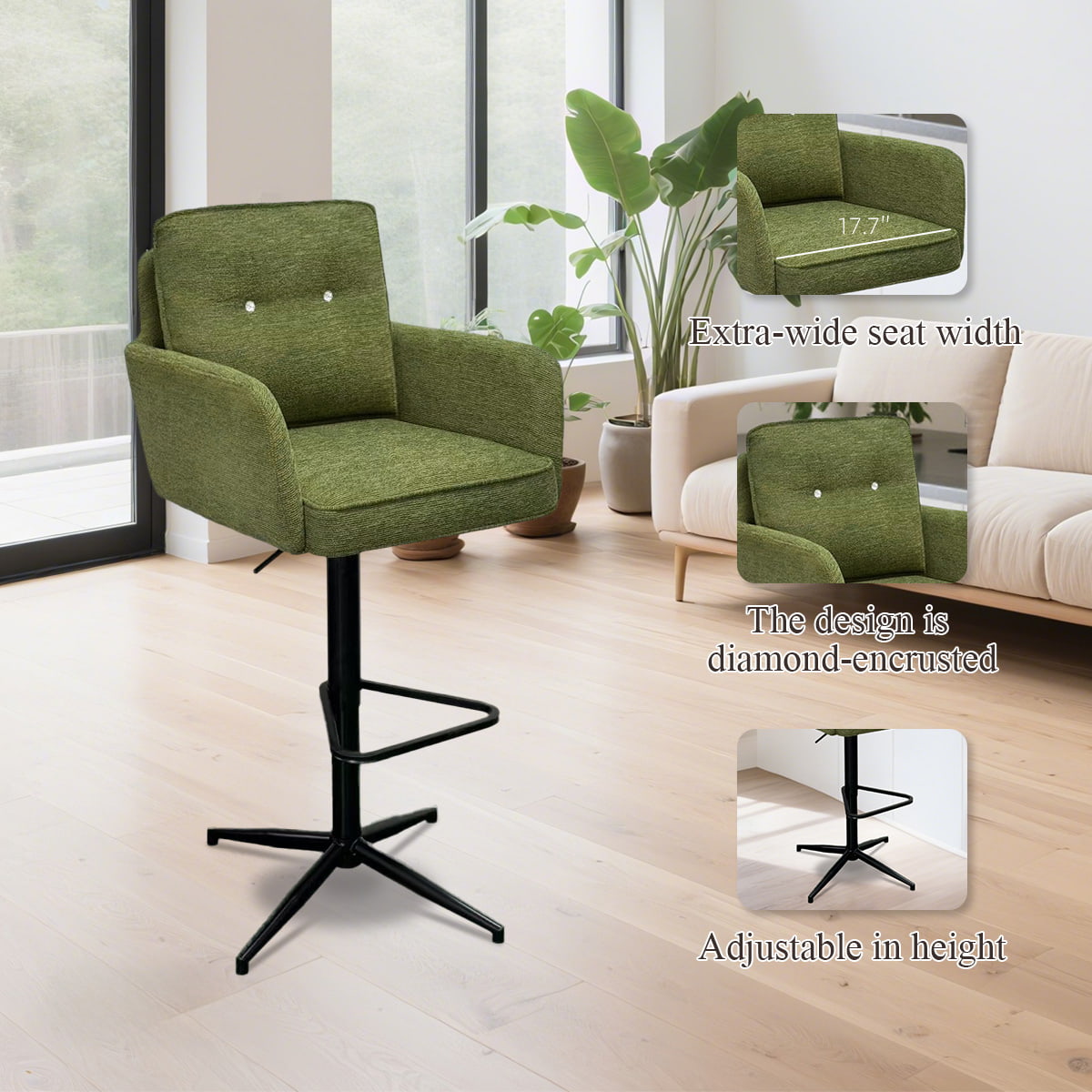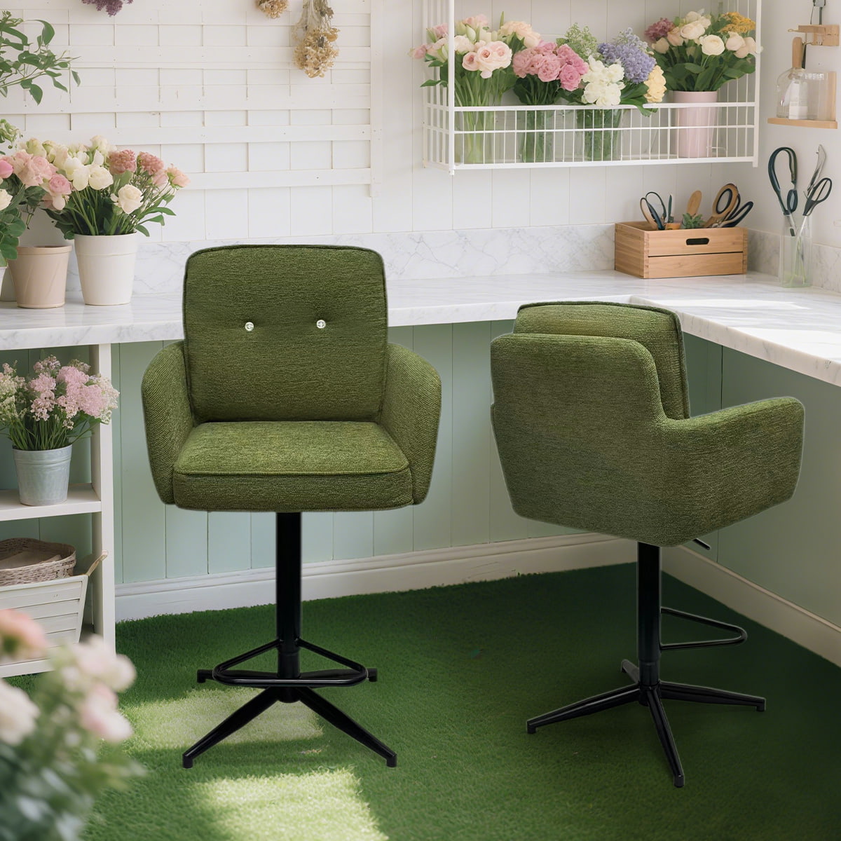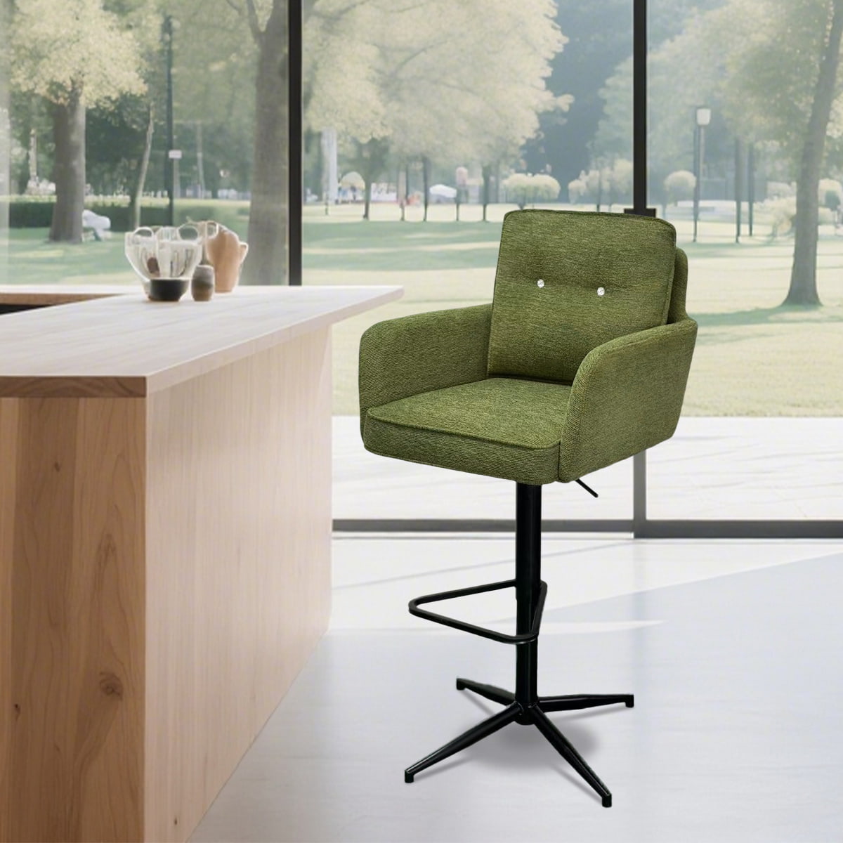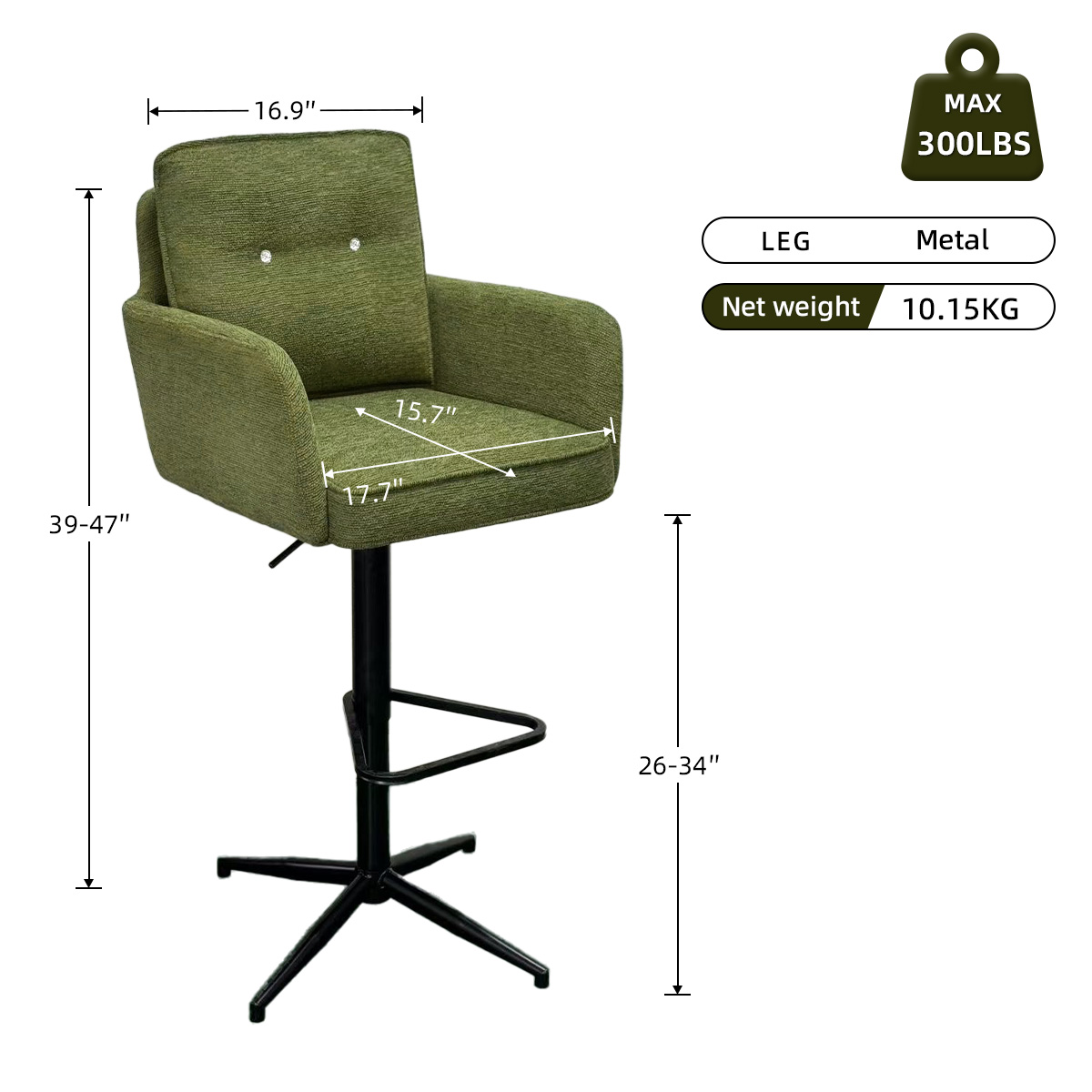 Notre produit phare - le tabouret de bar pivotant réglable en tissu vert moderne est idéal pour le bar de cuisine, la salle à manger ou l'espace salon. Le siège est rembourré en tissu vert, qui est confortable au toucher et facile à nettoyer. La conception conviviale comprend une fonction de réglage de la hauteur; Base pivotante à 360 ° avec mécanisme de retour automatique et repose-pieds triangulaires intégrée. La base métallique à revêtement en poudre noire stable est non seulement durable et résistante à la corrosion, mais a également une conception de support anti-TIP à quatre pouces.