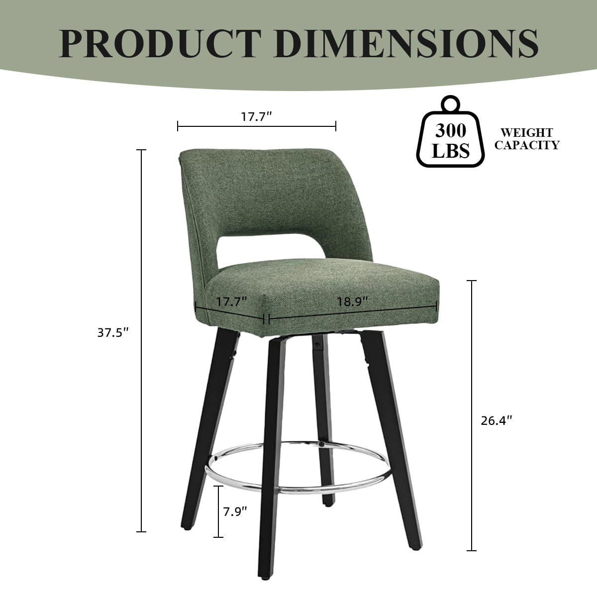 Tabouret de bar pivotant vert moderne à hauteur de comptoir avec dossier et pieds en métal | Chaises de bar rembourrées en lin pour îlot de cuisine et pub à domicile
