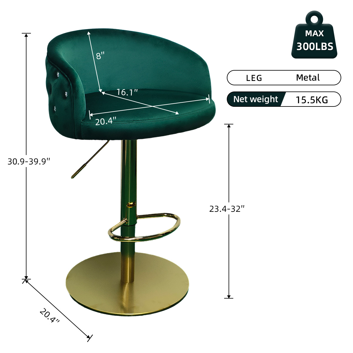 Notre produit phare - Ce tabouret de bar réglable en velours moderne est en tissu en velours émeraude de haute qualité et associé à un design de dossier matelassé classique (dossier tufté), qui est à la fois rétro et élégant. Les jambes des selles sont en base en or métallique, qui est stable et durable. Équipé d'un dispositif de levage pneumatique hydraulique, la hauteur peut être facilement ajustée; La conception pivotante à 360 ° vous permet de tourner librement. Ce tabouret de bar peut être associé à un bar, une table à manger et placé dans le salon, le café, la réception, la cuisine et le restaurant!