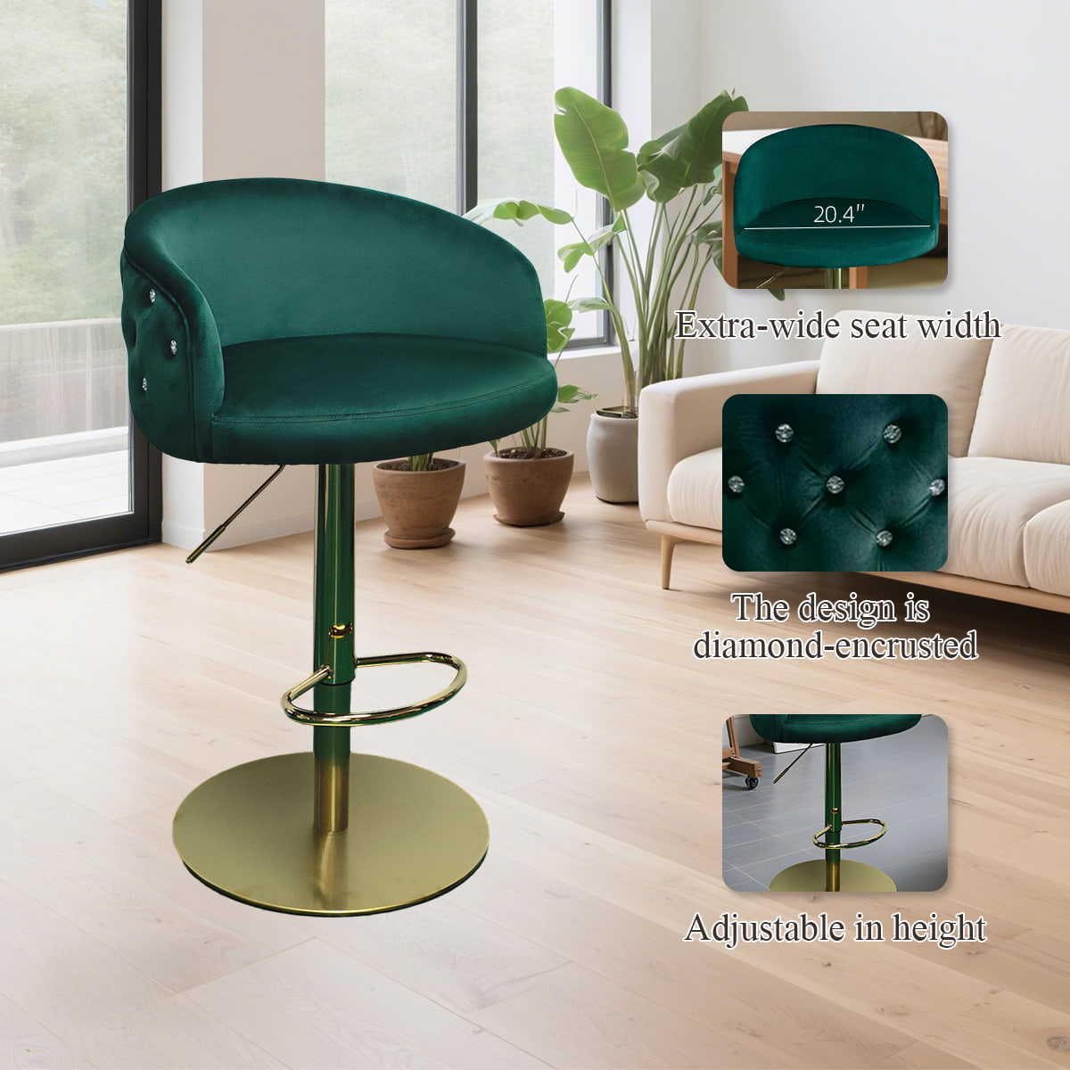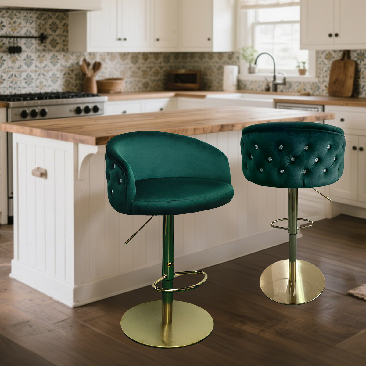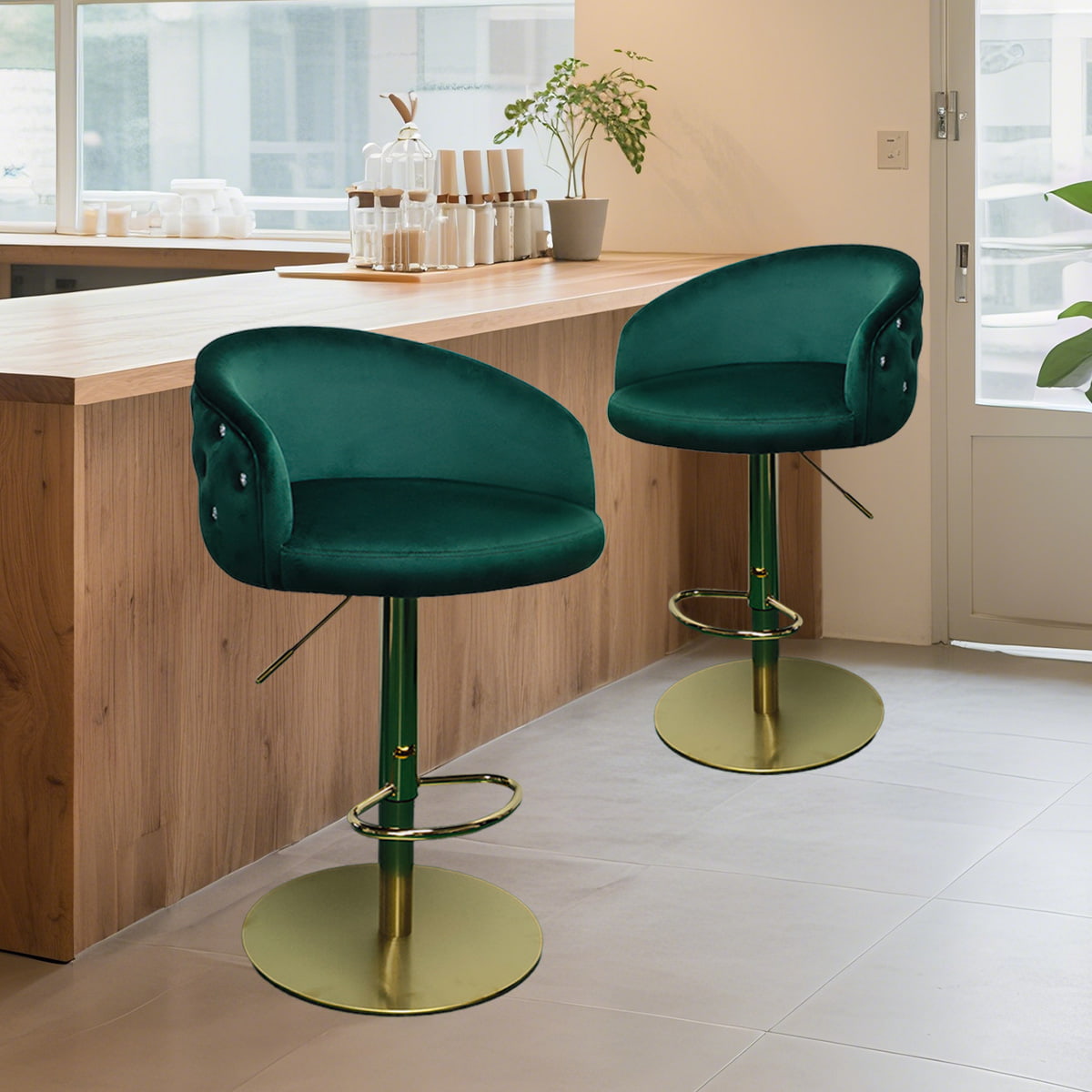 Tabouret de bar réglable en velours vert moderne avec dossier tufté et base d'or
