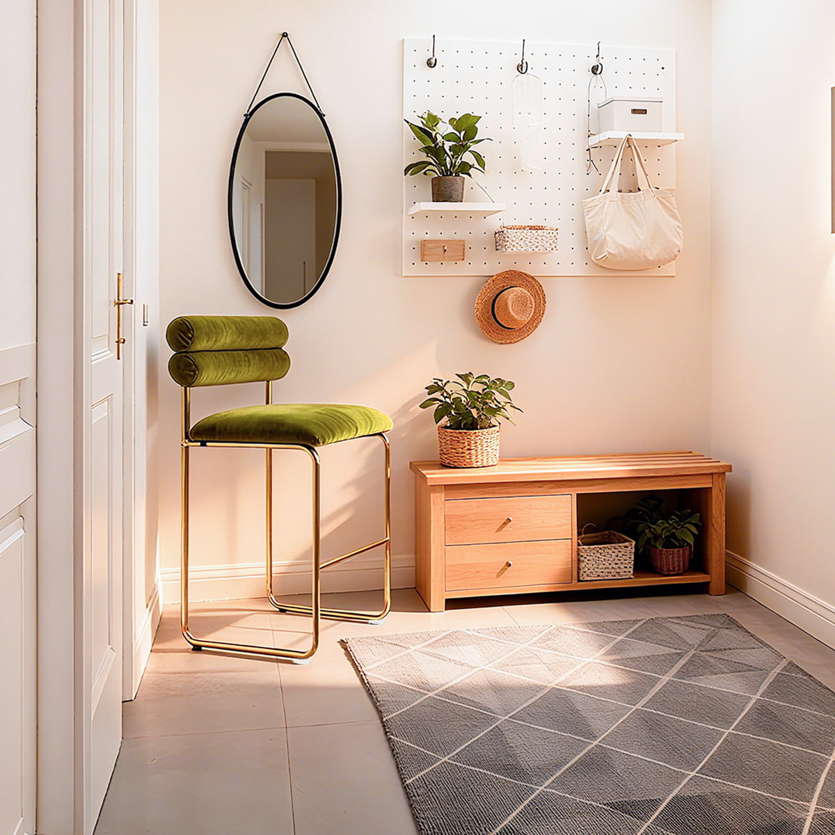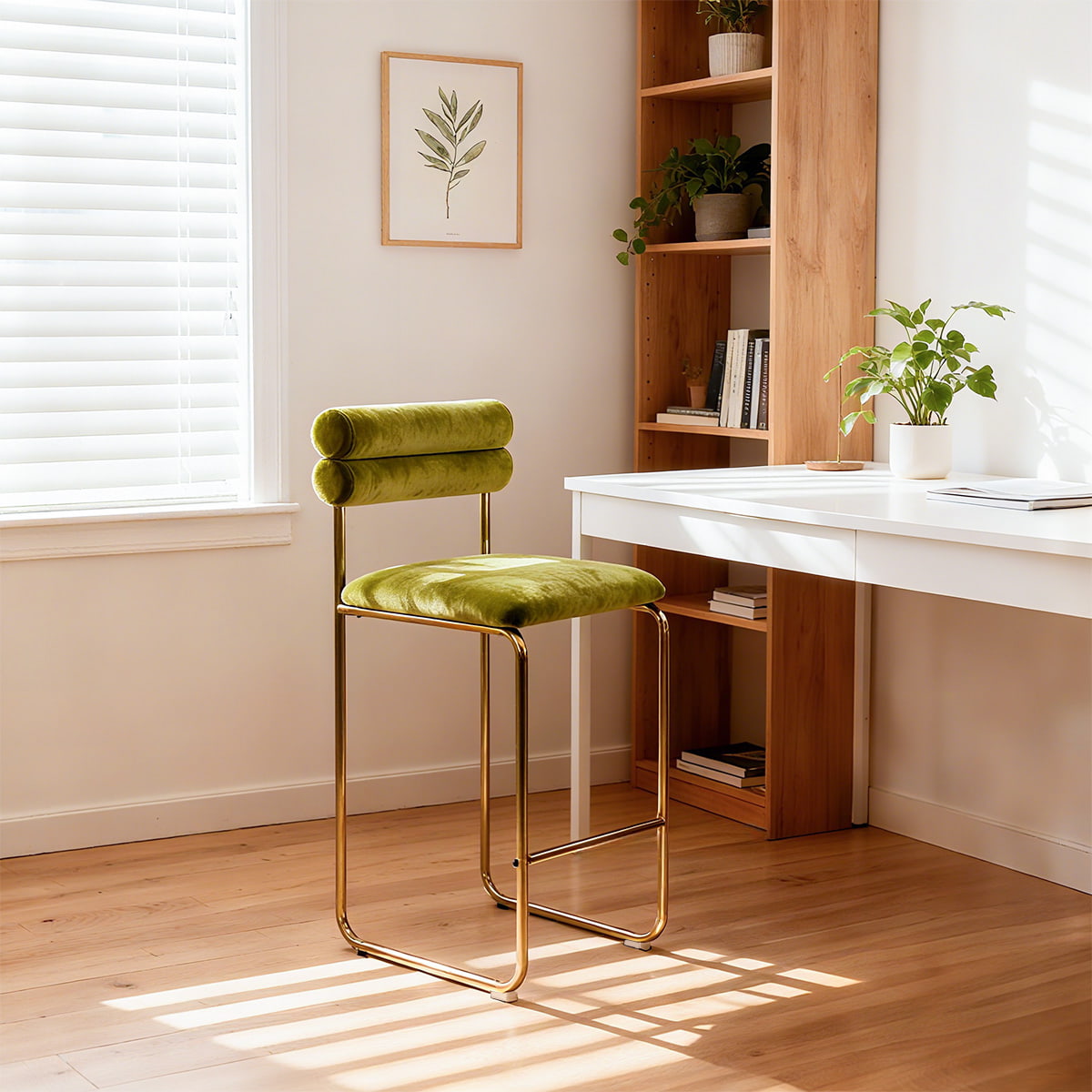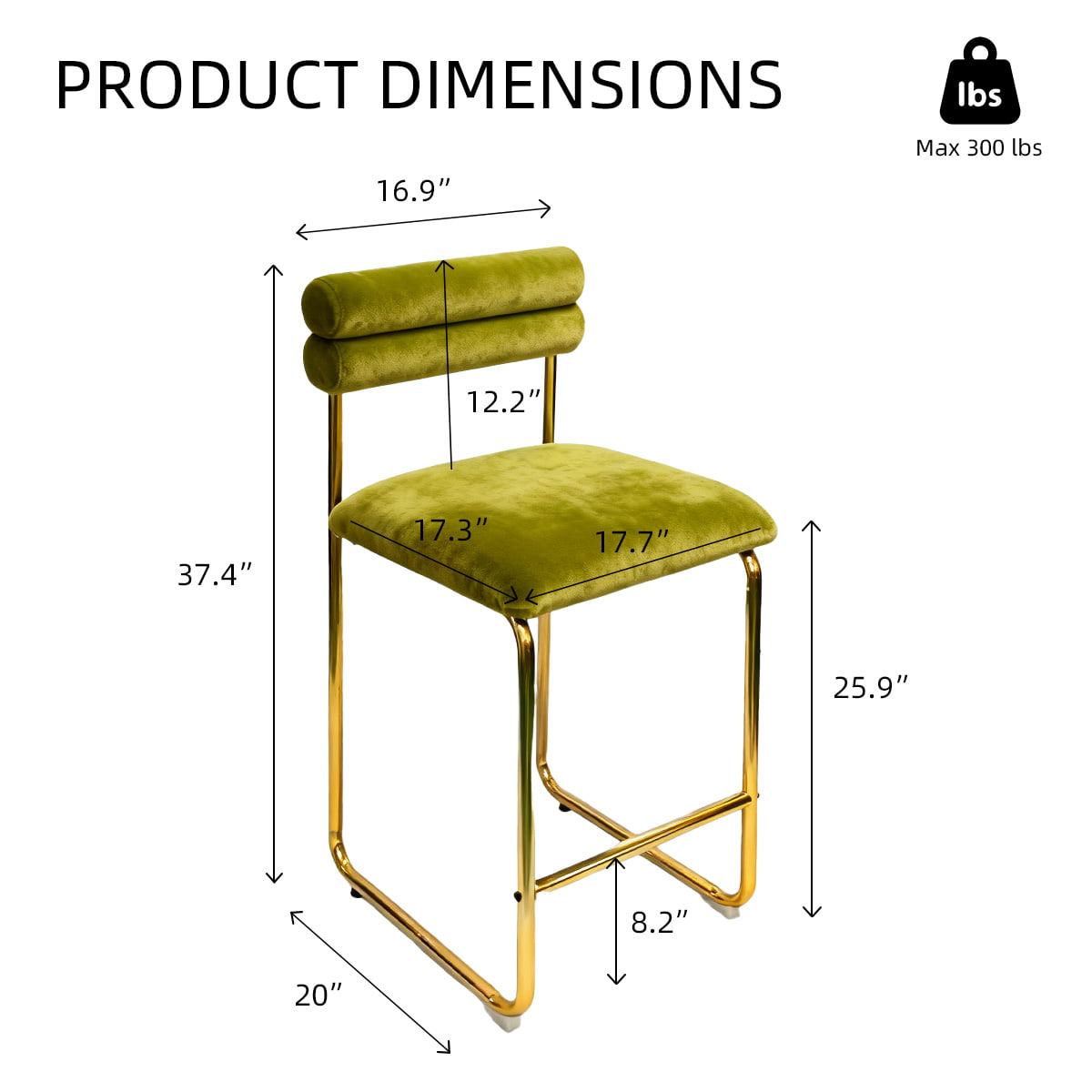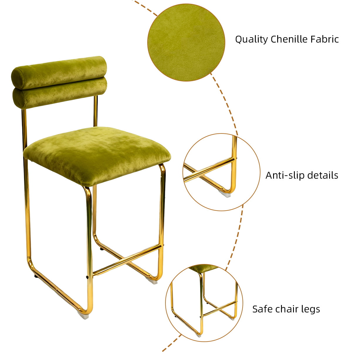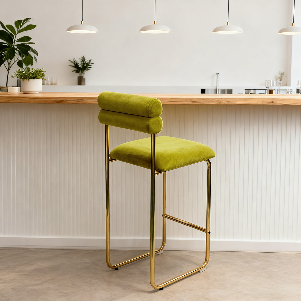 Sa hauteur de 37,4 pouces s'adapte aux comptoirs de cuisine et aux bars à manger standard, tandis que le siège de 25,9 pouces assure un confort optimal pour les longues conversations ou les repas décontractés. Le revêtement en velours doux offre une expérience tactile luxueuse et les pieds plaqués or ajoutent une touche raffinée. Avec un coussin en mousse haute résilience et une base antidérapante, ce tabouret est conçu pour allier confort, style et durabilité — parfait pour les espaces domestiques et commerciaux.