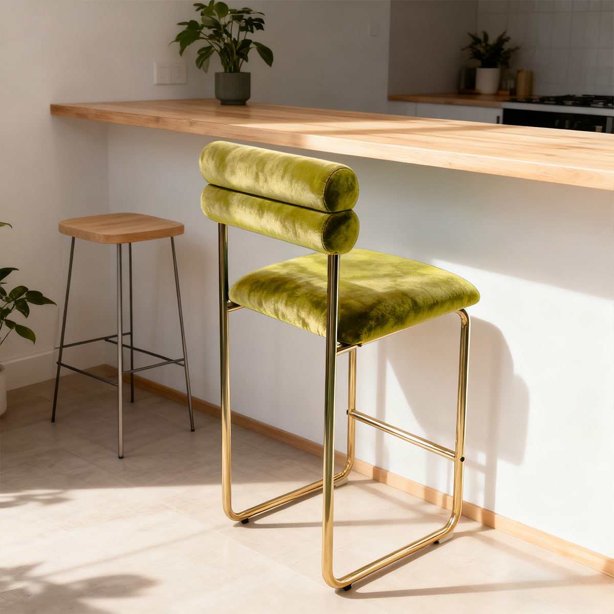 Tabouret de bar moderne en velours vert à hauteur de comptoir avec cadre en métal doré et repose-pieds — Chaise rembourrée minimaliste pour îlot de cuisine, salle à manger, café ou réception