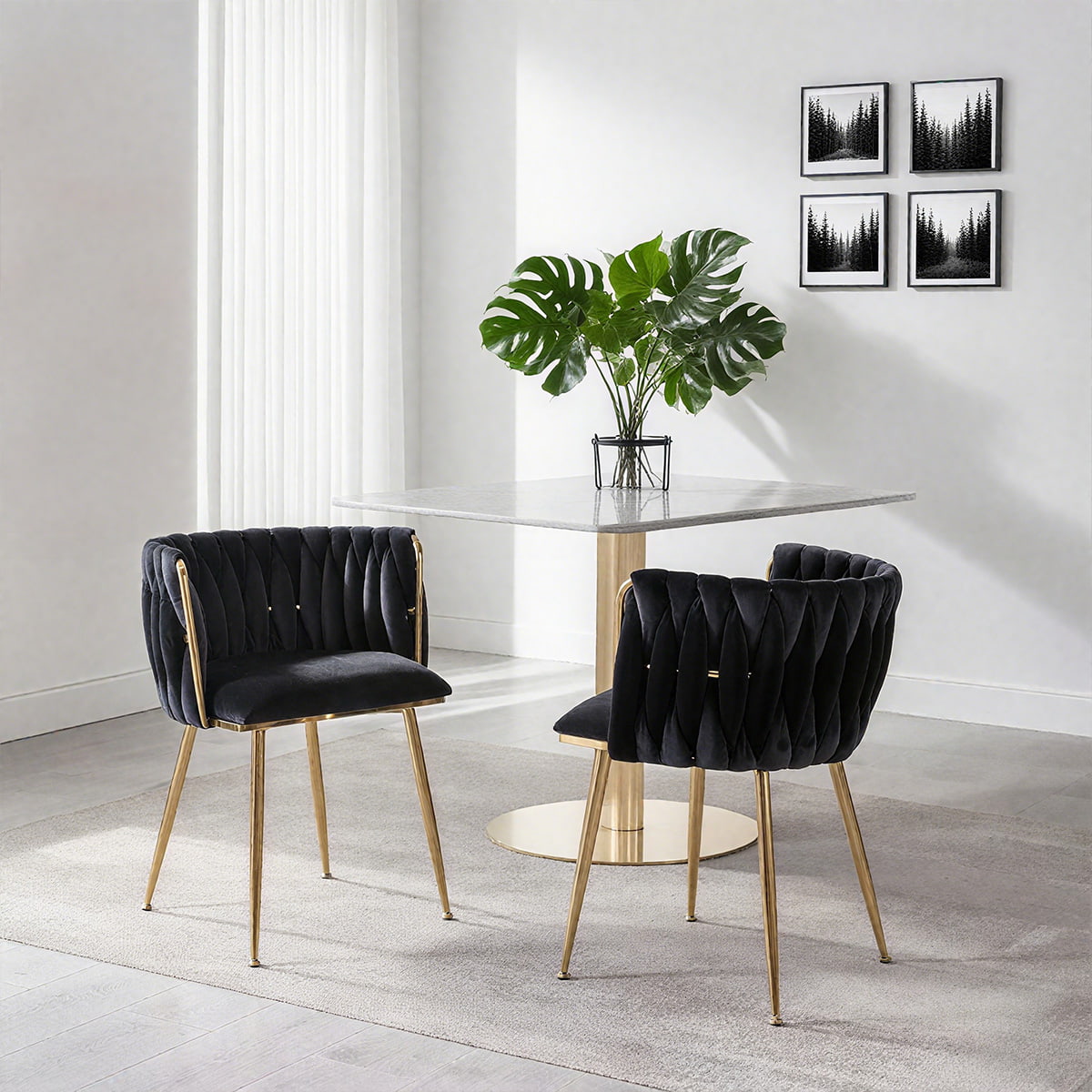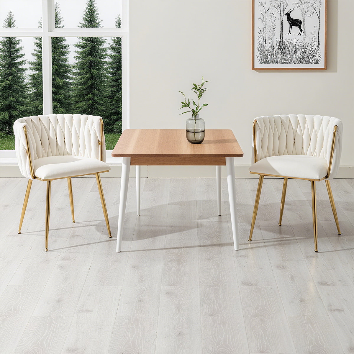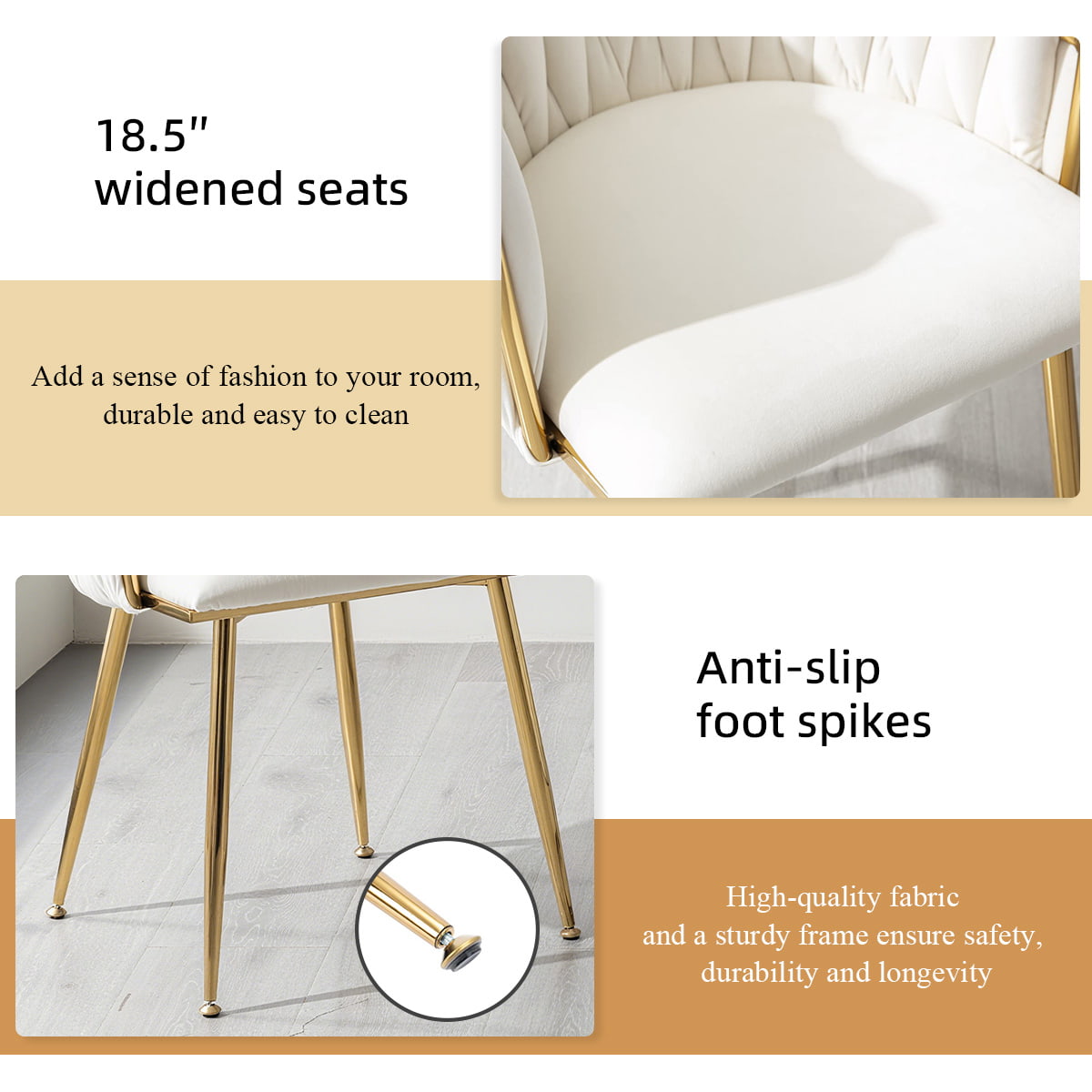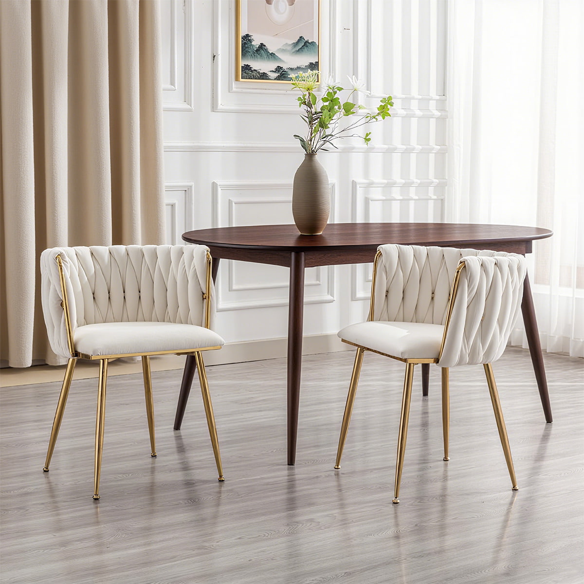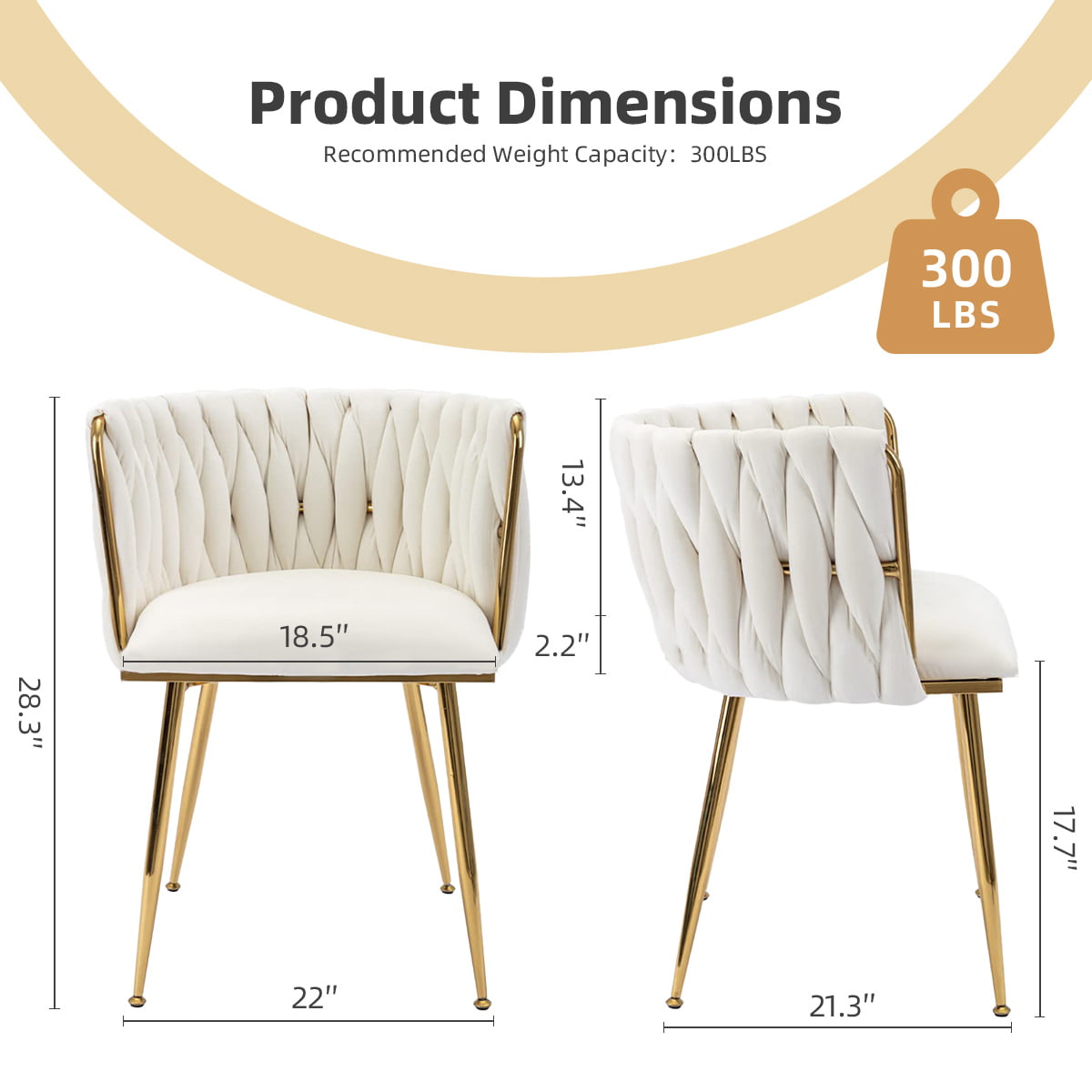 Cette chaise de salle à manger rembourrée en velours ivoire avec dossier tissé est une chaise d'accentuation moderne polyvalente, un tabouret de vanité et une chaise latéral du milieu du siècle. Doté du tissu de velours de luxe, des jambes en métal doré, du soutien au dos ergonomique et des coussins en mousse à haute densité, il est conçu à la fois pour le confort et le style. Idéal pour les salles à manger, les salons, les chambres, les salles de vanité, les bureaux, les cafés et les hôtels, il répond aux besoins des utilisateurs à la maison et des acheteurs commerciaux.