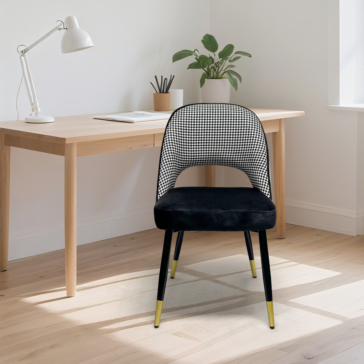 Parfait pour les salles de restauration, les bureaux, les dressings et les espaces de réception, la silhouette sans bras de cette chaise est idéale pour les arrangements compacts. Ses pattes de métal noir enrobées de poudre offrent de la stabilité, tandis que les accents d'or à la base ajoutent une finition de luxe. Les coussinets anti-rayures réglables offrent un soutien supplémentaire et aident à maintenir l'équilibre sur les planchers inégaux.