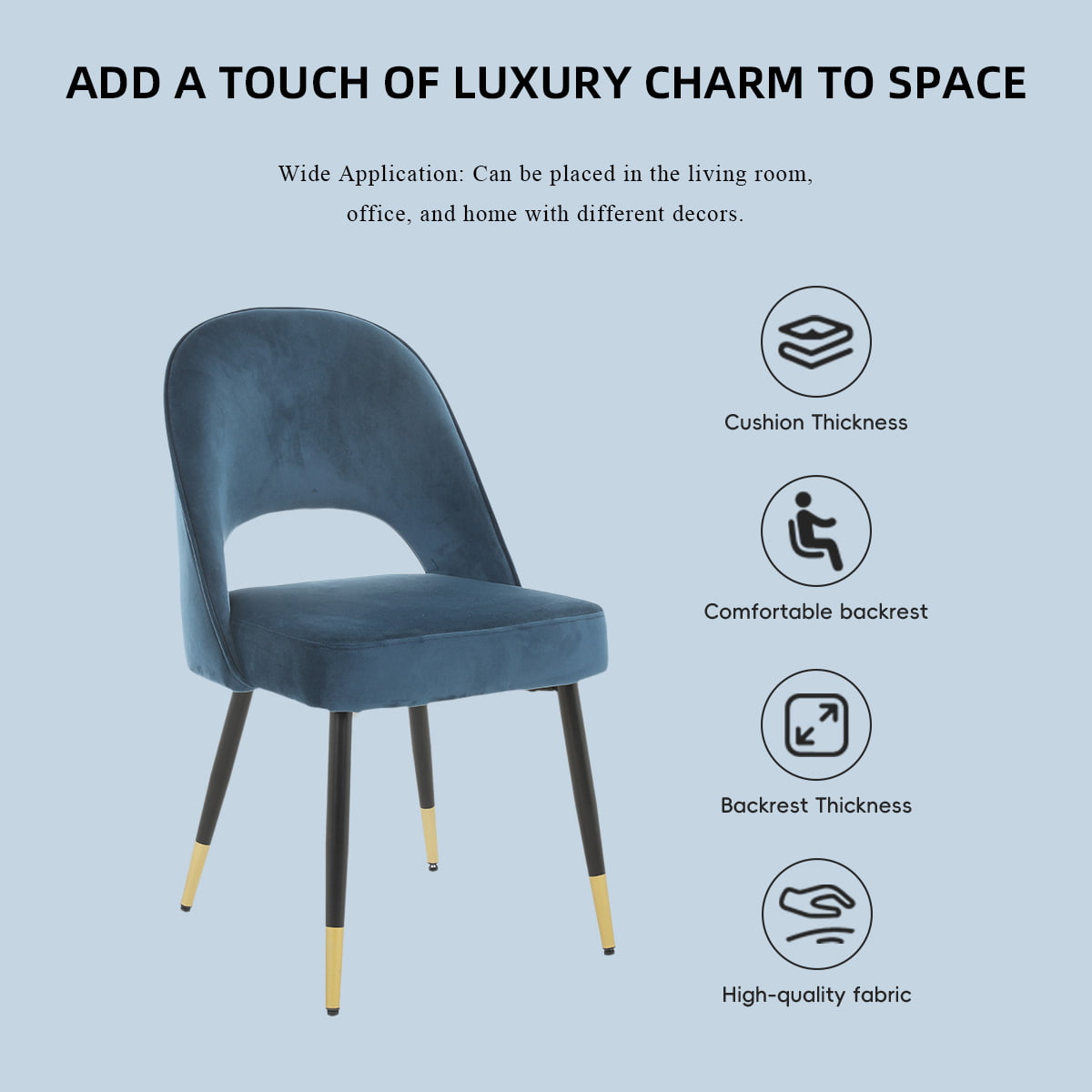 Chaise à manger moderne en velours bleu avec dos creux et jambes en métal à pointe or - chaise d'accent rembourré sans bras pour salle à manger, bureau ou vanité