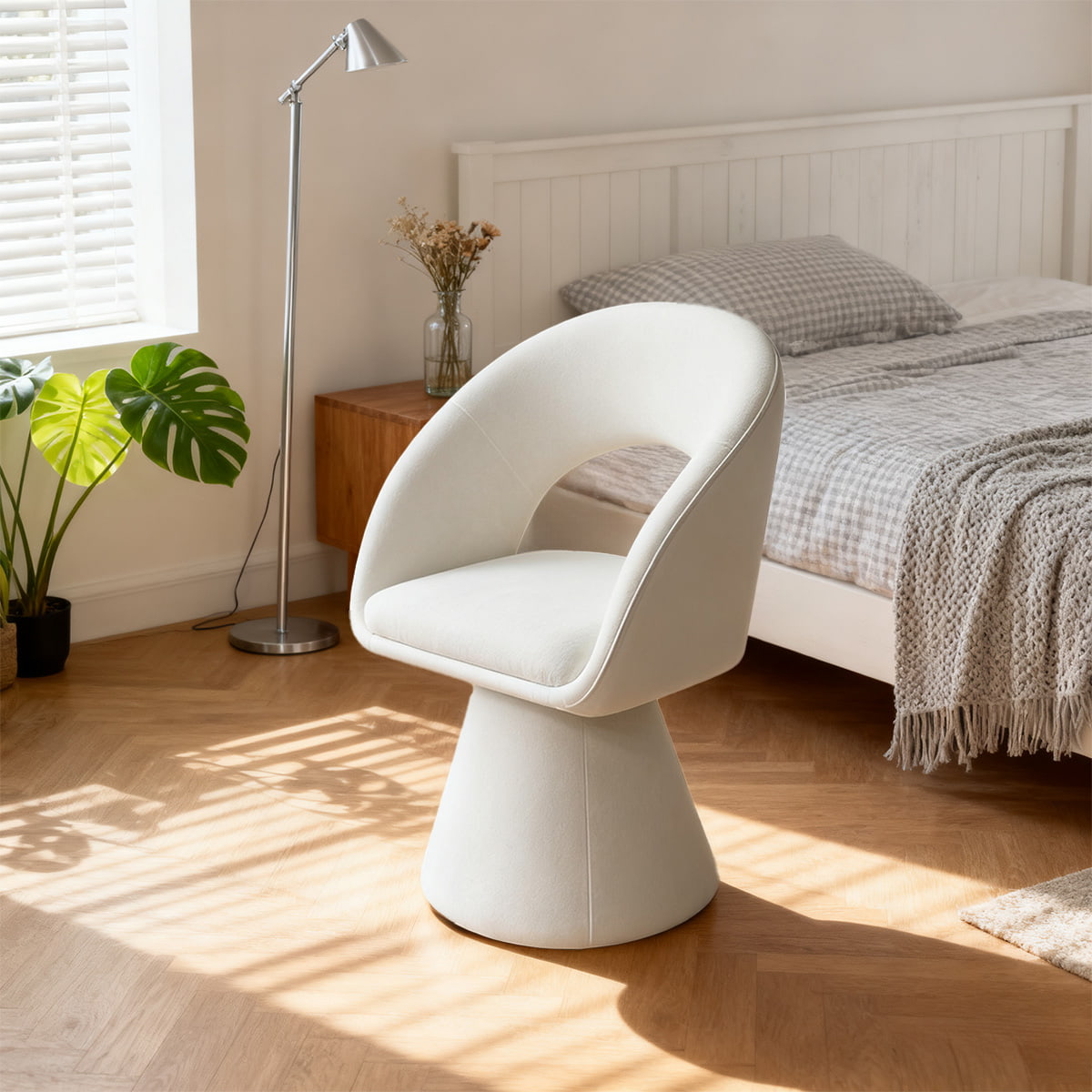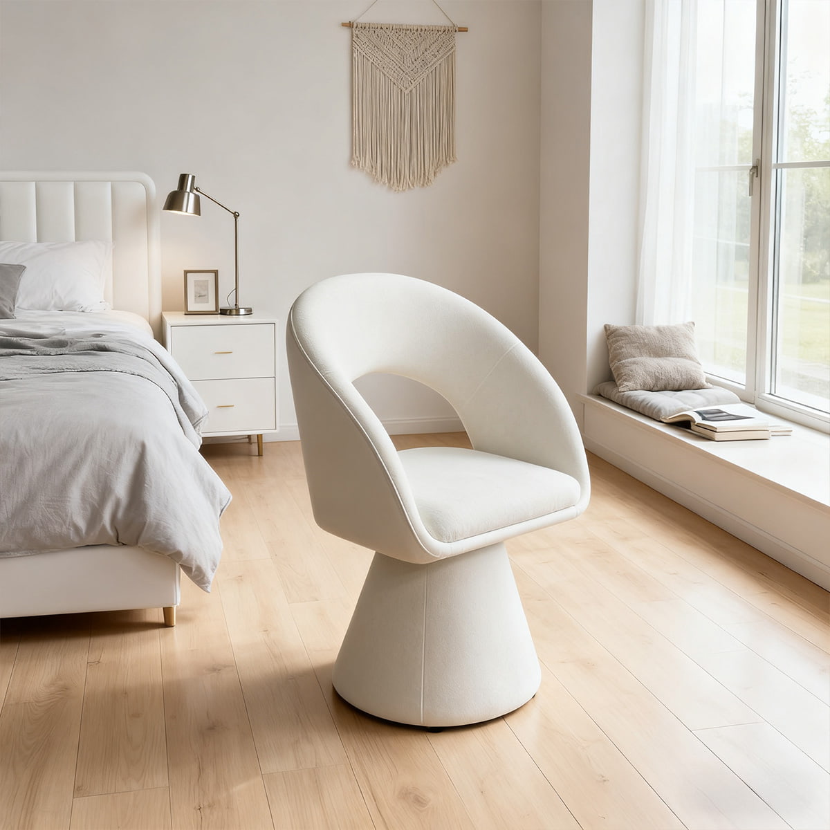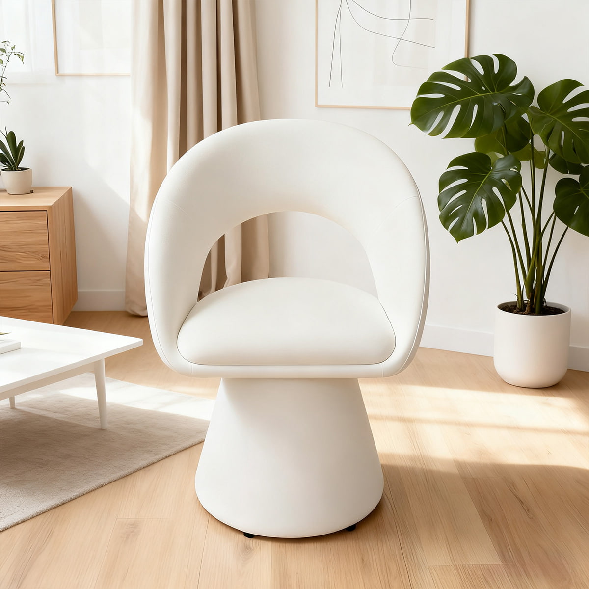 Chaise d'appoint pivotante en velours blanc crème au design incurvé moderne – Chaise de salle à manger et de loisirs rembourrée rotative à 360° avec dossier creux