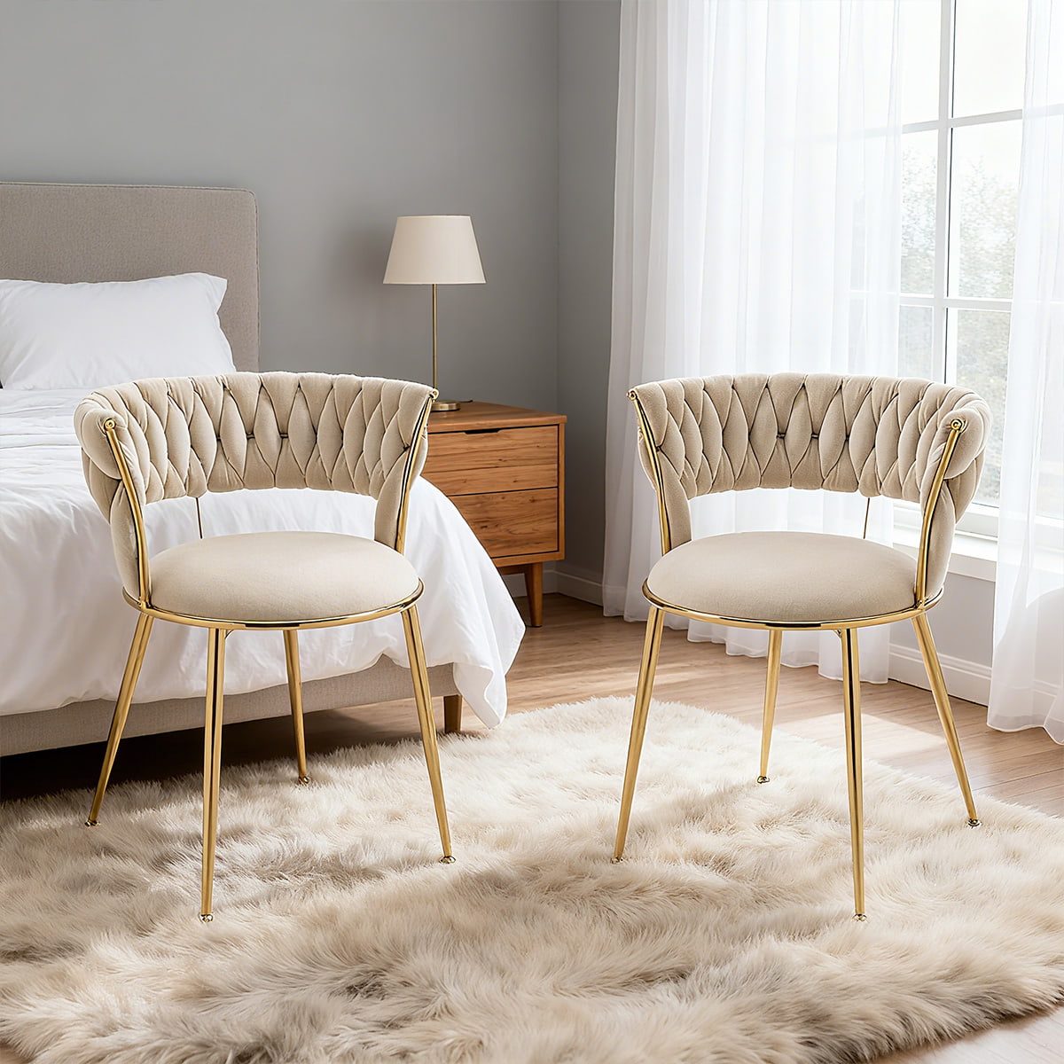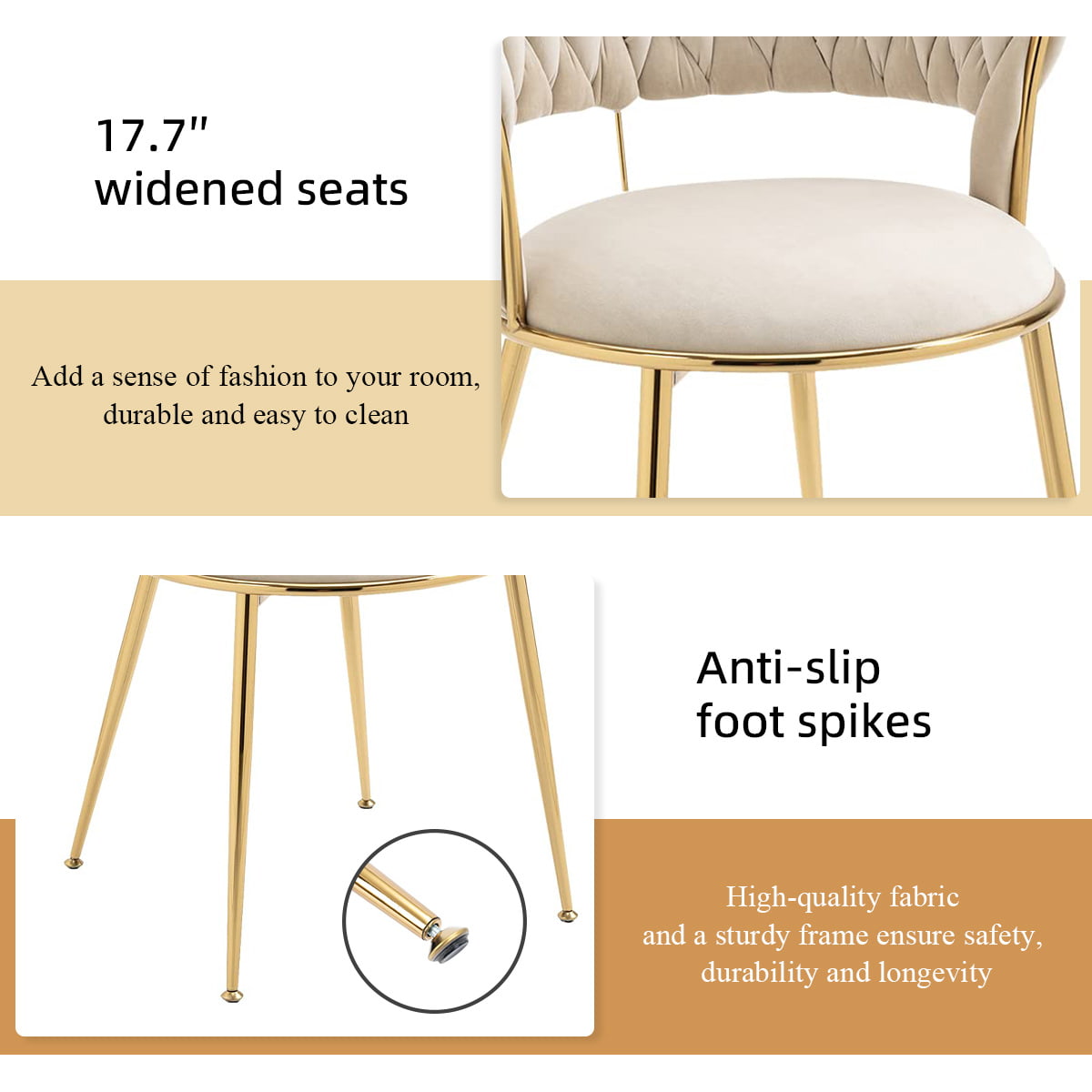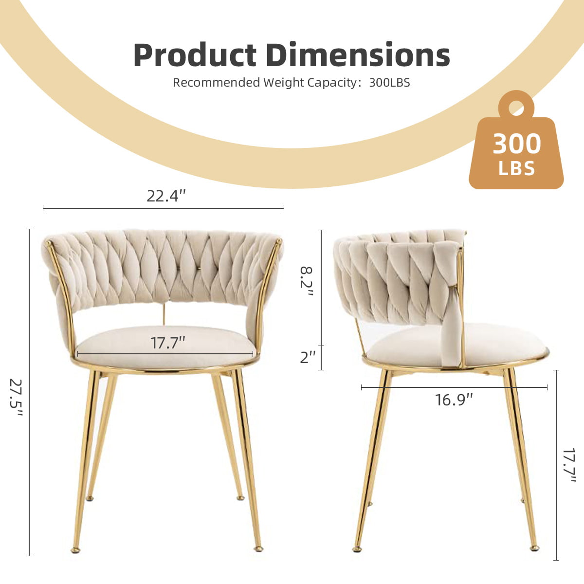 Chaise de salle à manger moderne en velours ivoire avec dossier tissé et pieds en métal doré – Chaise d'appoint rembourrée élégante pour salle à manger, cuisine ou espace de vie