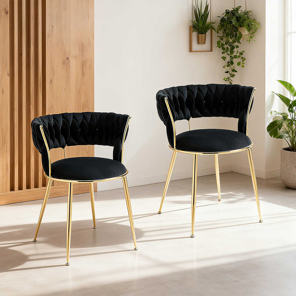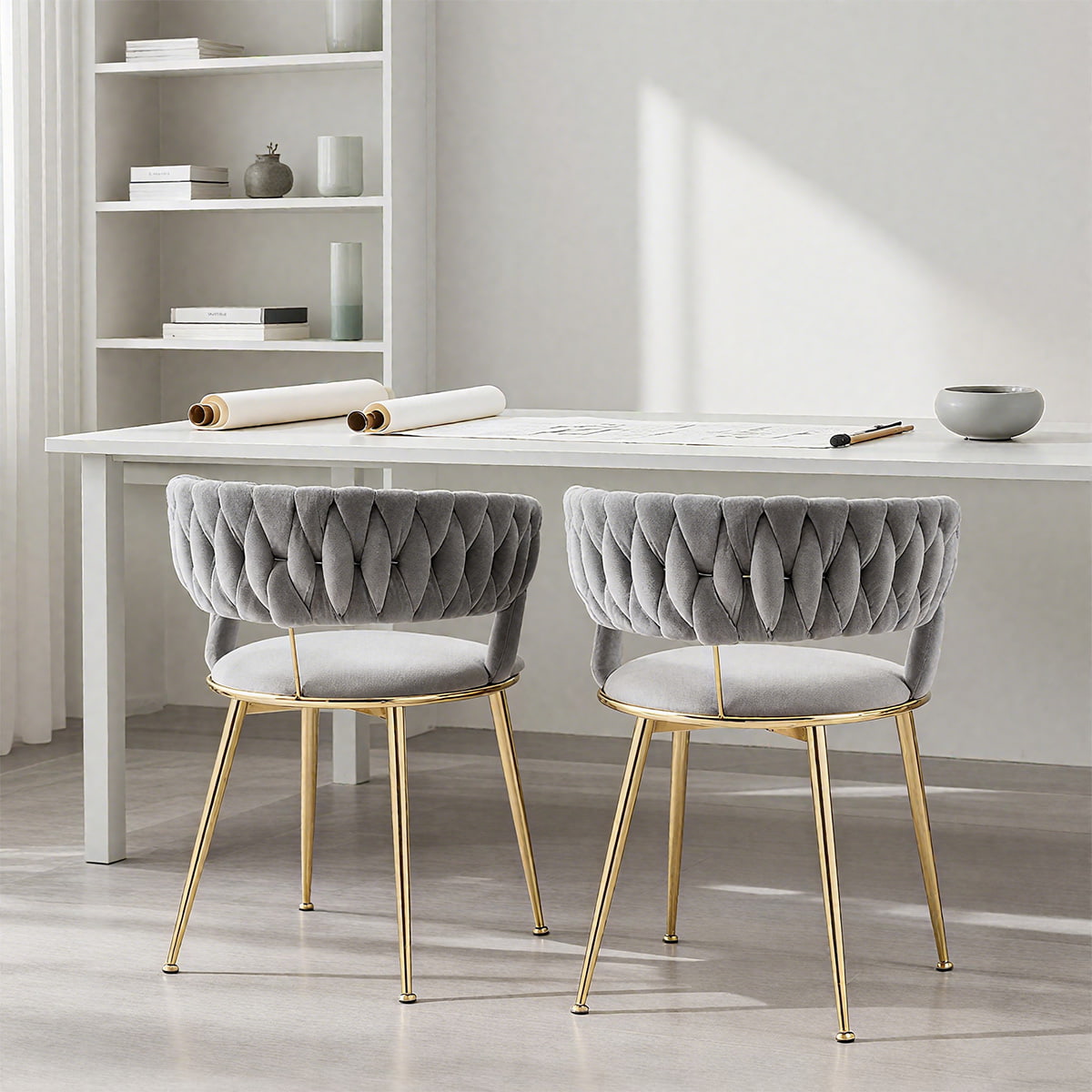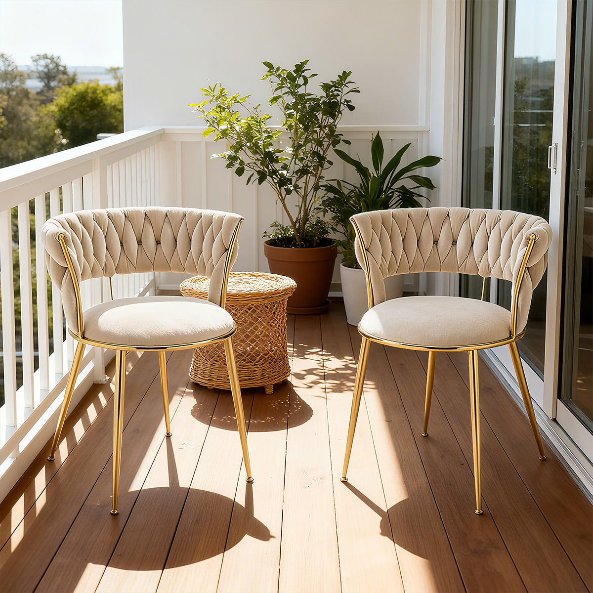 Chaise de salle à manger moderne en velours ivoire avec dossier tissé et pieds en métal doré – Chaise d'appoint rembourrée élégante pour salle à manger, cuisine ou espace de vie