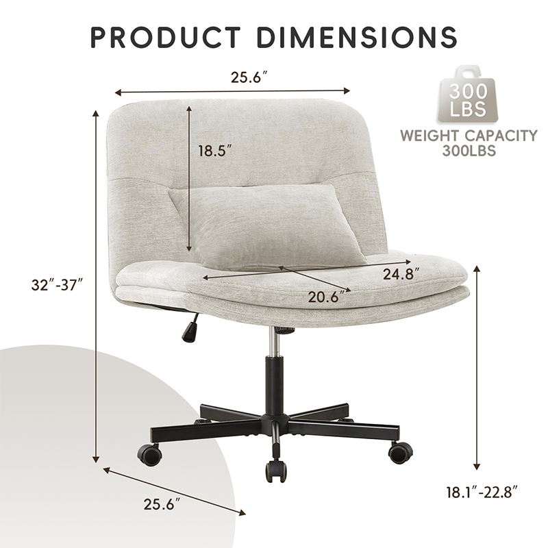 La conception sans bras de la chaise permet une plus grande flexibilité de mouvement, en particulier pour les utilisateurs de pattes croisées ou de calibre latérale. Avec une plage de hauteur réglable de 5,5 pouces et une fonctionnalité pivotante à 360 °, cette chaise de tâche s'adapte parfaitement à toute hauteur de bureau ou à toute disposition de la pièce. Il dispose également d'une base silencieuse et en douceur avec cinq roulettes durables et un cadre métallique robuste qui prend en charge jusqu'à 300 livres.