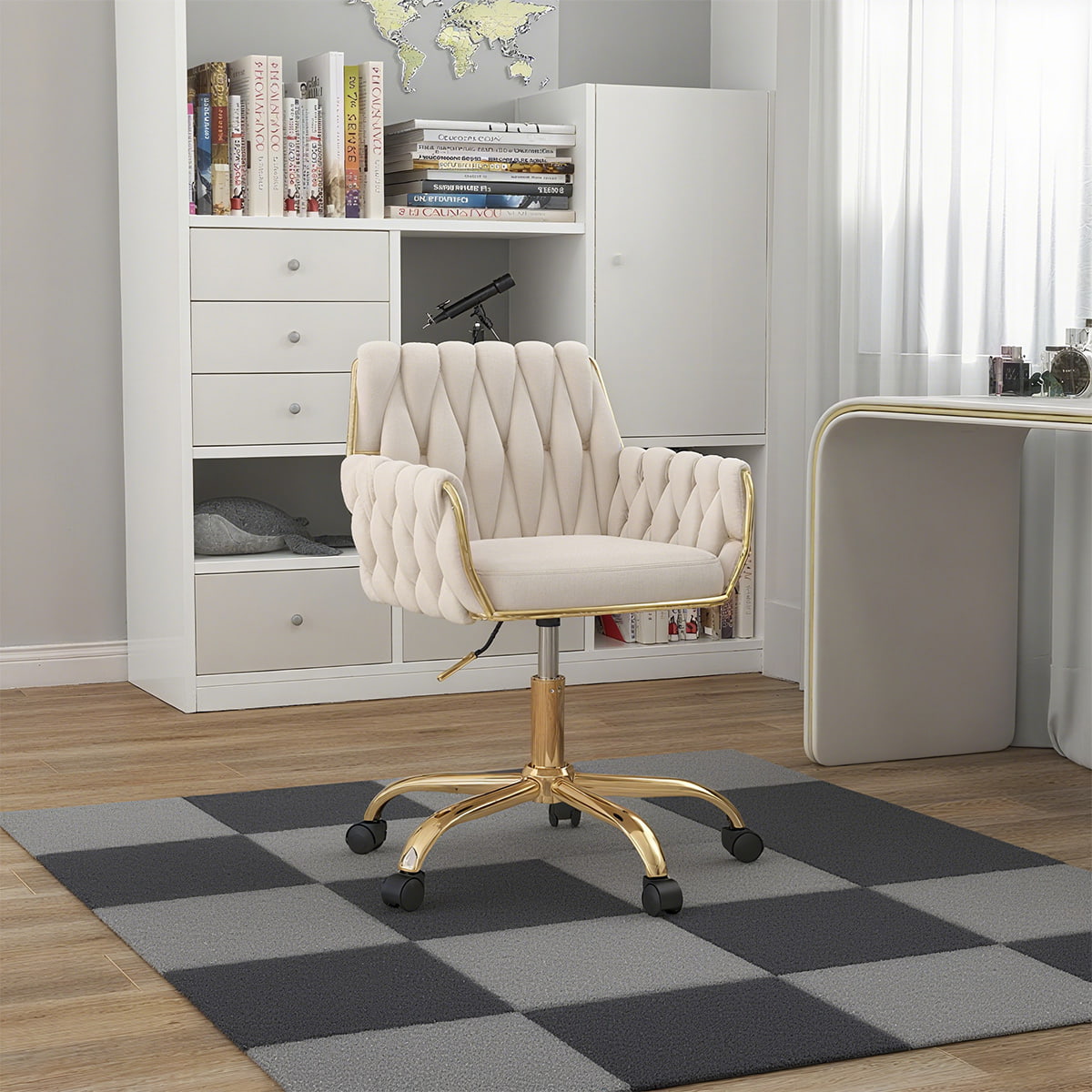 Chaise de bureau à domicile en velours beige - chaise de vanité réglable moderne avec base dorée, dossier et accoudoir tissé à la main, chaise de bureau à roulettes pivotant à 360 °