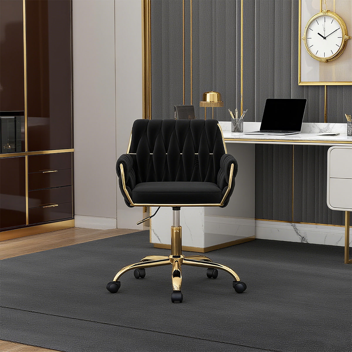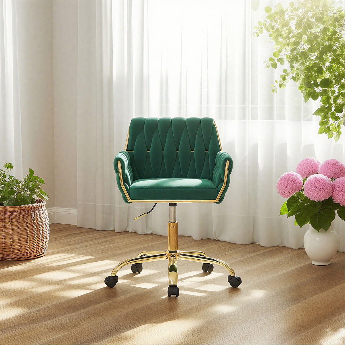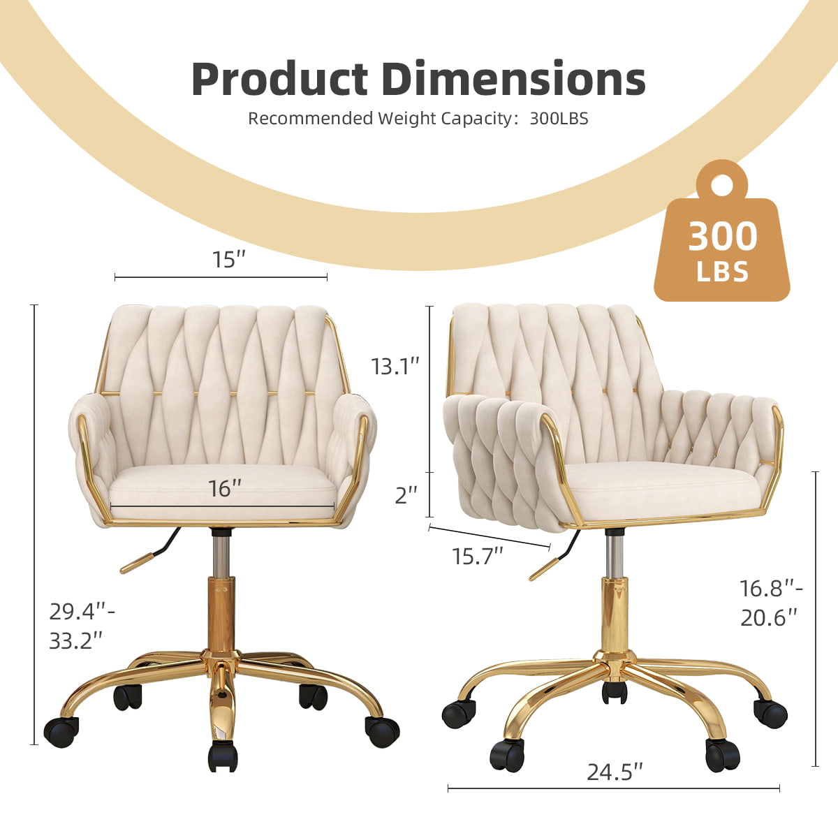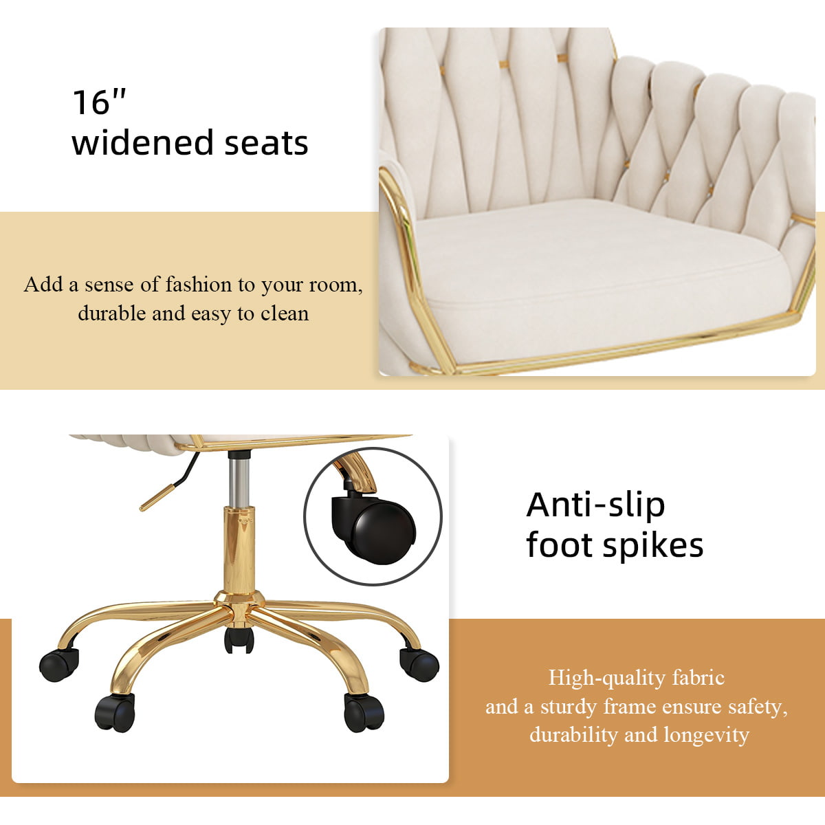 Cette chaise de bureau en velours beige moderne avec base d'or est la chaise de vanité idéale, la chaise de bureau à domicile et la chaise pivotante de salle d'étude. Avec un revêtement de velours de luxe, un dossier tissé ergonomique, des accoudoirs rembourrés et une hauteur de siège réglable, il assure un confort toute la journée tout en améliorant votre décoration intérieure. La base pivotante à 360 ° avec des roulettes lisses le rend polyvalent pour le travail, le maquillage, la lecture ou le jeu.