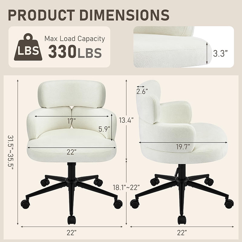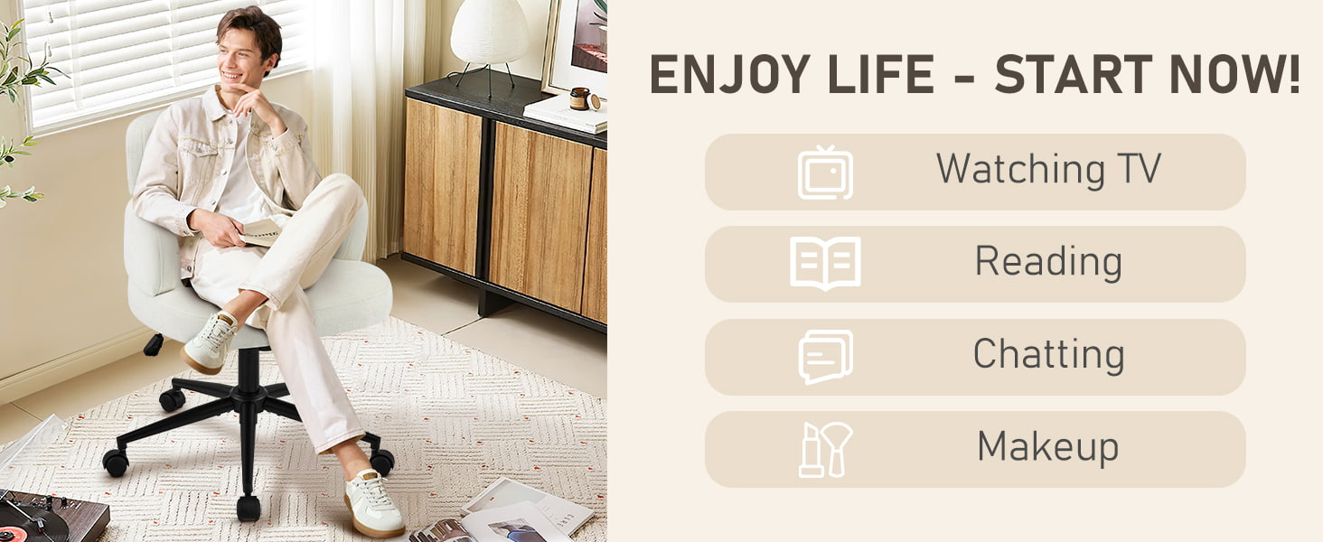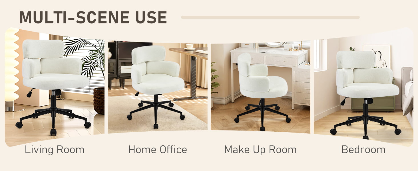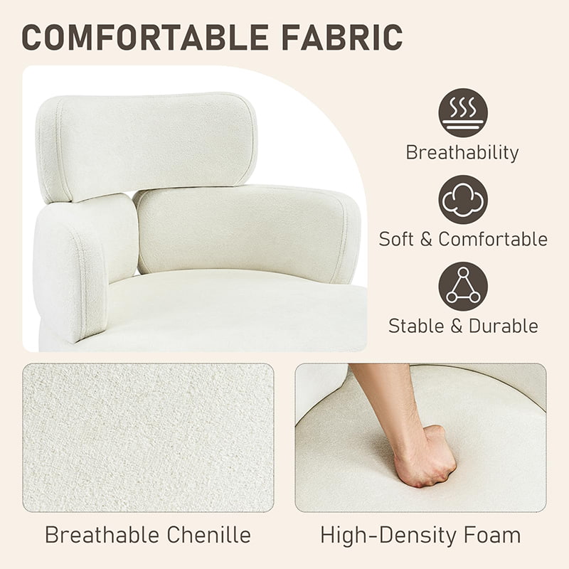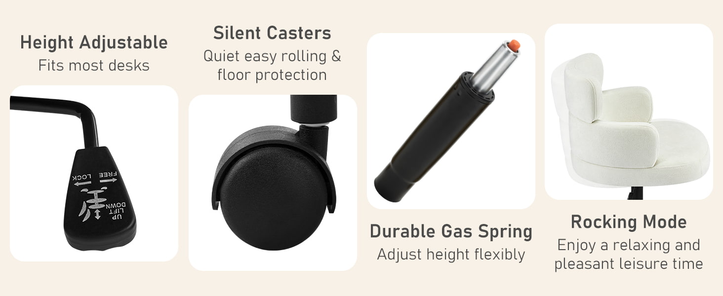 Enveloppée dans un tissu chenille respirant et soutenue par un épais coussin en mousse, la chaise offre un confort durable pour travailler, lire ou se détendre. La hauteur du siège réglable, le pivotement fluide à 360° et la fonction de bascule douce permettent aux utilisateurs de personnaliser facilement leur position assise. Une base en métal robuste avec des roulettes silencieuses assure la stabilité, la mobilité et la protection du sol, ce qui en fait une solution d'assise pratique et élégante pour la vie contemporaine.