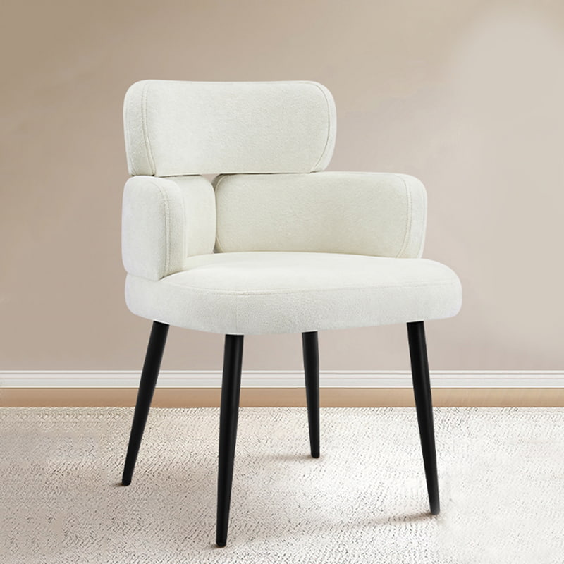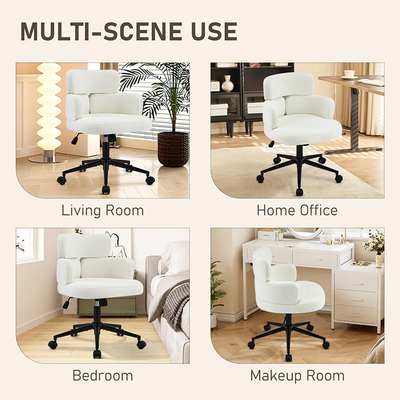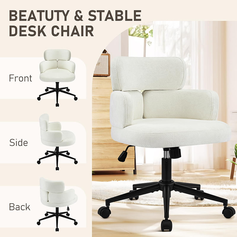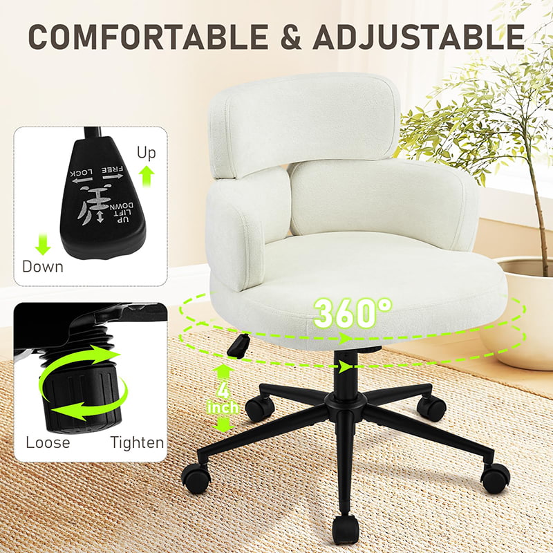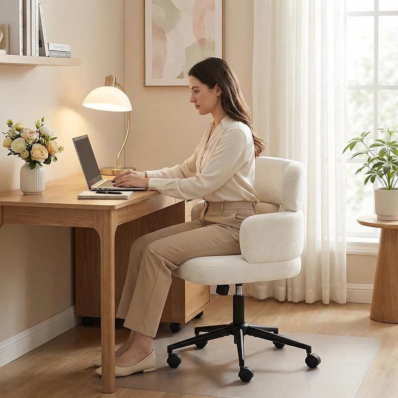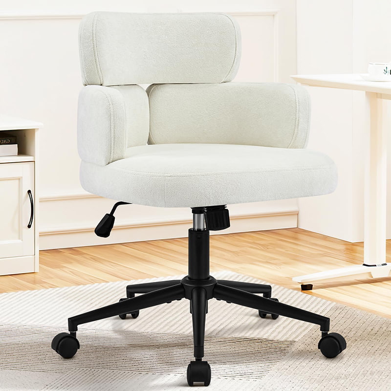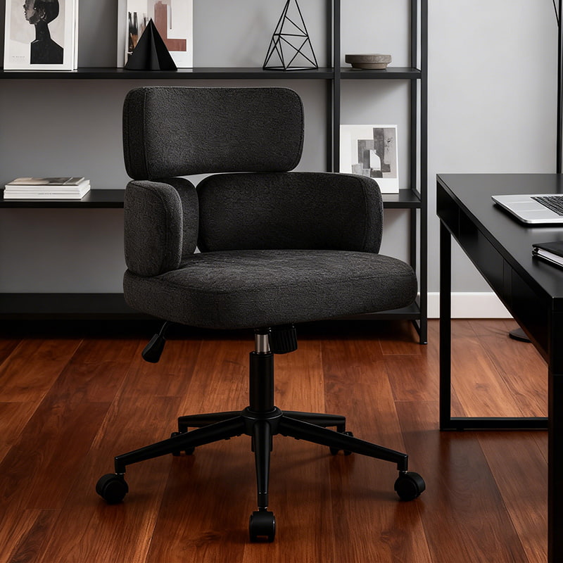 Cette chaise de bureau pivotante rembourrée est conçue pour les bureaux à domicile modernes, les espaces de travail de boutique et les intérieurs axés sur le style de vie. Dotée d'un dossier distinctif en forme de trèfle avec accoudoirs intégrés, cette chaise allie attrait visuel et ergonomie fonctionnelle. Le siège large et légèrement rembourré est recouvert d'un tissu chenille doux pour la peau, offrant une expérience d'assise moelleuse et confortable pour de longues heures de travail, de lecture ou de détente. Un mécanisme réglable en hauteur, un pivotement fluide à 360 degrés et une fonction de bascule douce permettent aux utilisateurs de personnaliser facilement leur position assise, tandis que la base en métal robuste et les roulettes silencieuses assurent la stabilité, la mobilité et la protection du sol dans différents environnements.