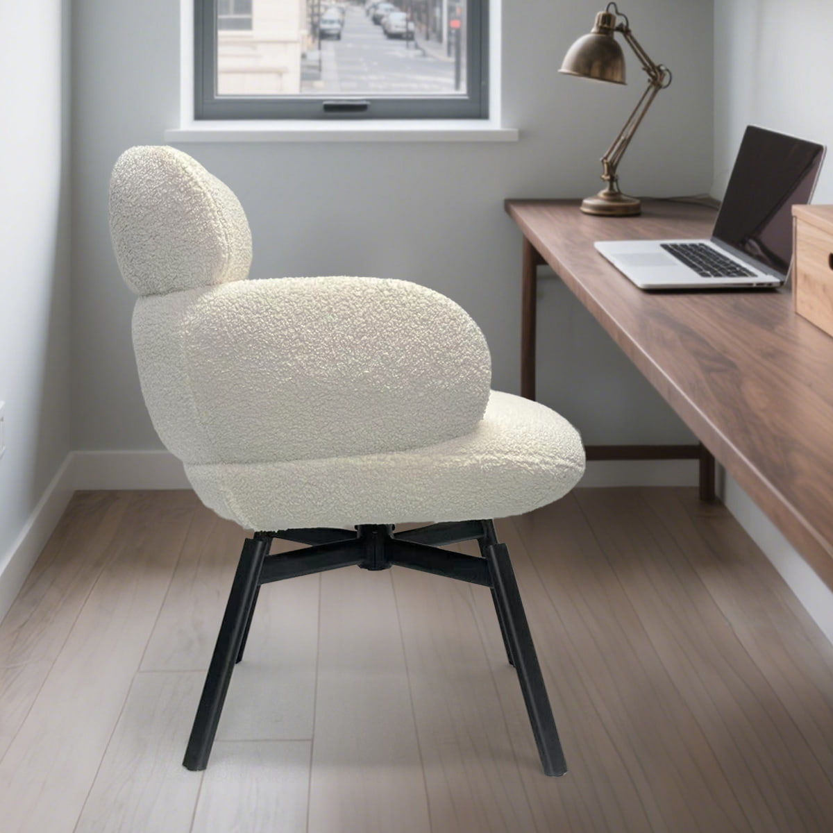 Notre produit phare - Chaise de salon pivotant en tissu moderne bouclé blanc / peluche avec des jambes en métal extra-large est une chaise de salon de style moderne, la chaise est en tissu de tissu bouclé blanc / ennefou de haute qualité. Le tissu de tissu bouclé / ennequille en peluche a non seulement une bonne élasticité et une bonne respirabilité, mais absorbe également efficacement la chaleur corporelle. Le dossier et le coussin de siège de la chaise sont conçus pour être larges, adaptés à une utilisation à long terme. La chaise est équipée de quatre pattes métalliques avec un revêtement en métal noir, ce qui ajoute à la sensation moderne globale et fournit un support solide. La base de cette chaise est un design pivotant, qui convient très à des espaces tels que des salons ou des salles d'étude.
