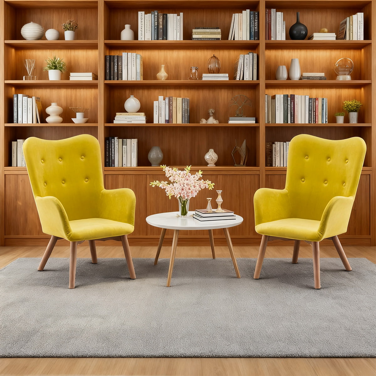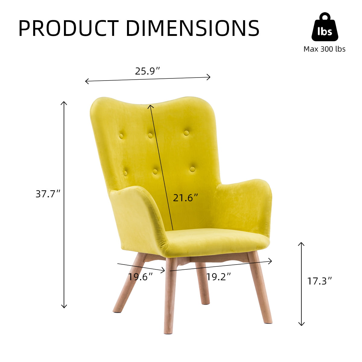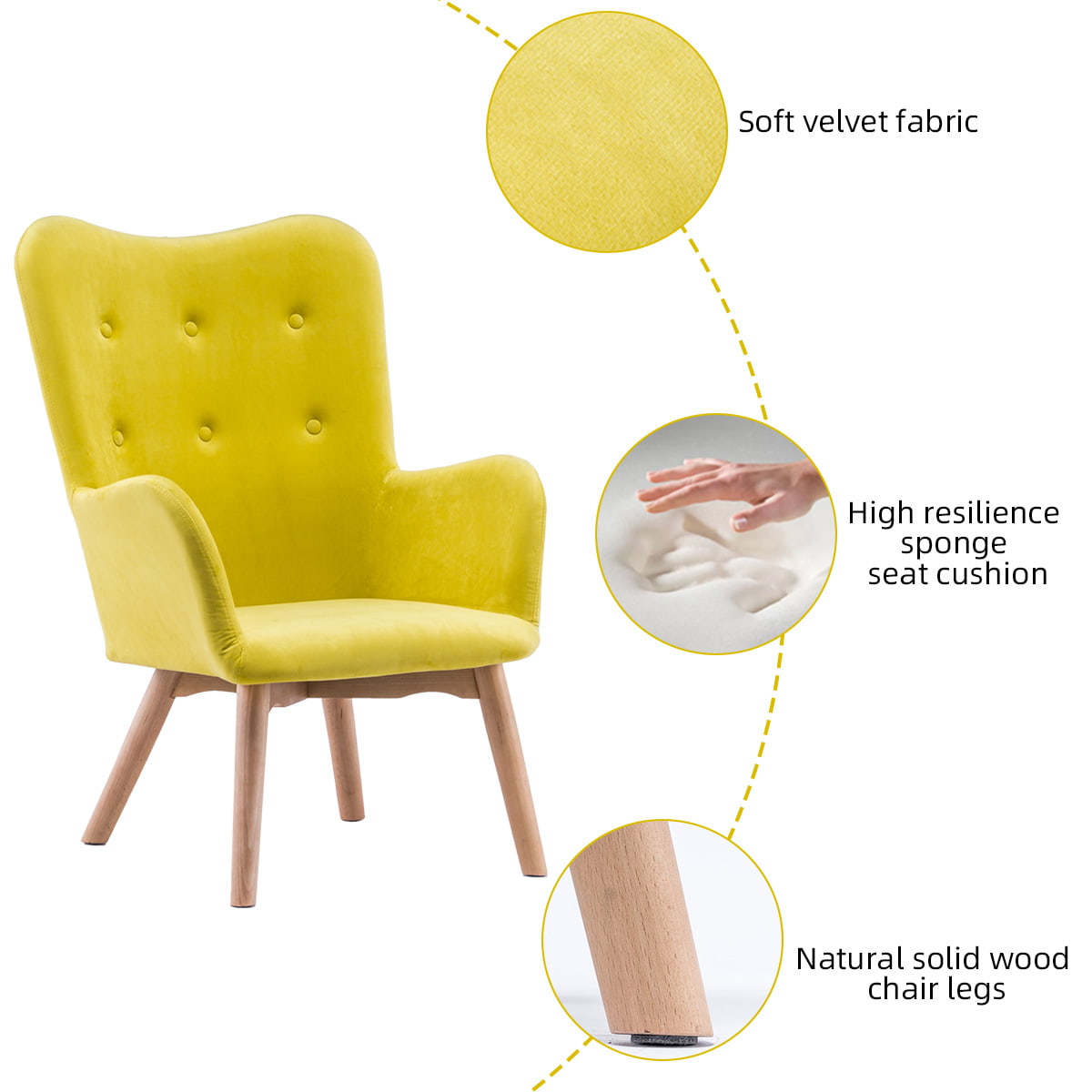 Fauteuil d'appoint moderne en velours jaune — Chaise de loisirs capitonnée à oreilles avec pieds et accoudoirs en bois pour salon, chambre ou bureau