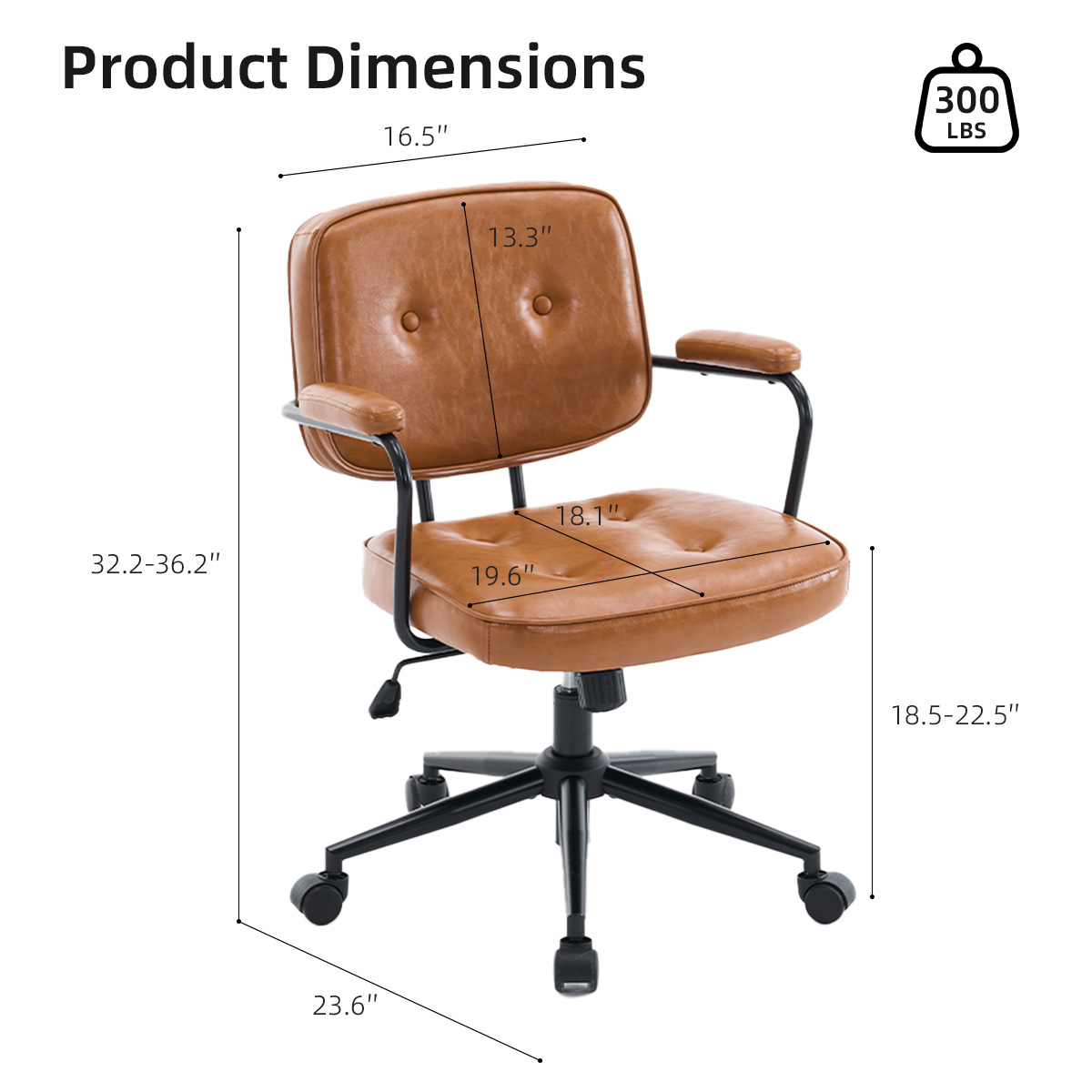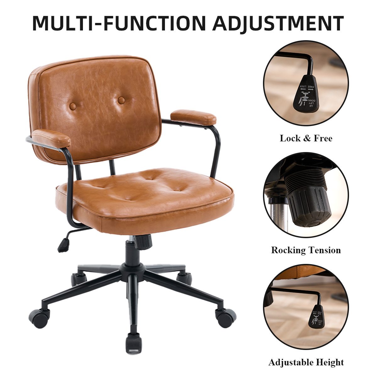 Construit avec une solide base métallique cinq étoiles et des roues de roulement silencieuses, cette chaise assure à la fois la mobilité et la stabilité. Le design d'inspiration vintage avec des détails à bouton-bouton et une finition chaude brun en faux cuir apporte un attrait sophistiqué et intemporel pour tout bureau à domicile, salle de conférence ou espace d'entreprise.